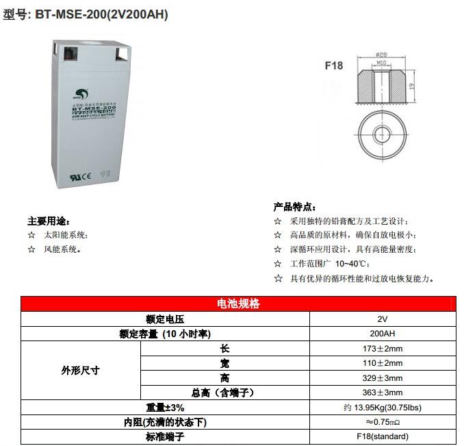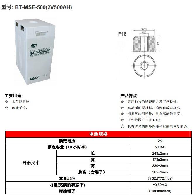 赛特蓄电池BT-MSE-(2V100Ah--3000Ah) 电力工程直流系统专用 赛特蓄电池BT-MSE(2V)系列产品特性 ●容量范围:100-3000AH; ●电压等级:2V; ●自放电小:≦1%/月; ●深充放电能力:耐深深放电能力好,有着较强的容量恢复能力; ●循环寿命:在标准使用条件下,25%DOD循环1800次以上; ●密封反应效率:≥99%; ●工作温度范围宽:0~40℃。